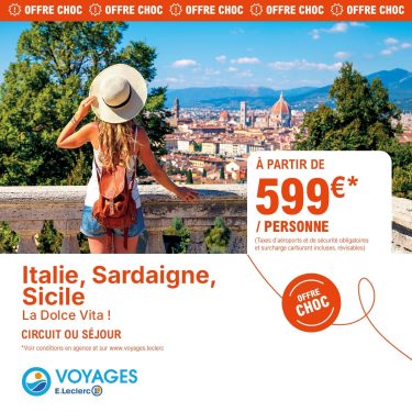 Au programme des voyages Leclerc : farniente au bord d’une plage de sable blond bordée d’eau turquoise, tourisme culturel dans les capitales d’Europe et dans le monde, vacances sportives, circuits à thèmes, pauses relaxation… Détente et plaisir sont au rendez-vous de votre escapade. La promesse d’instants inoubliables.